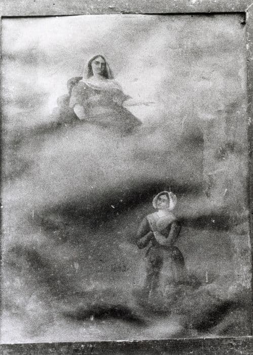 Une femme, agenouillée, prie la Vierge qui apparaît dans le ciel.