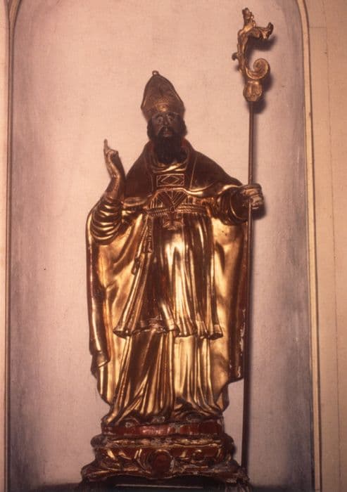 Le saint, debout et vêtu en évêque, indique le ciel de sa main droite.