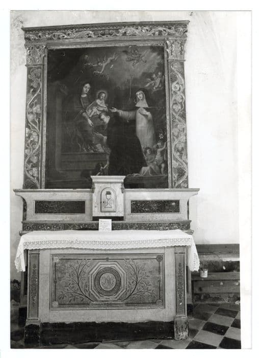 Retable constitué de deux pilastres corinthiens soutenant une architrave, formant le cadre du tableau d'autel.