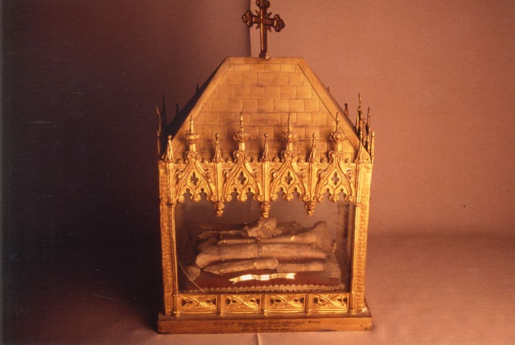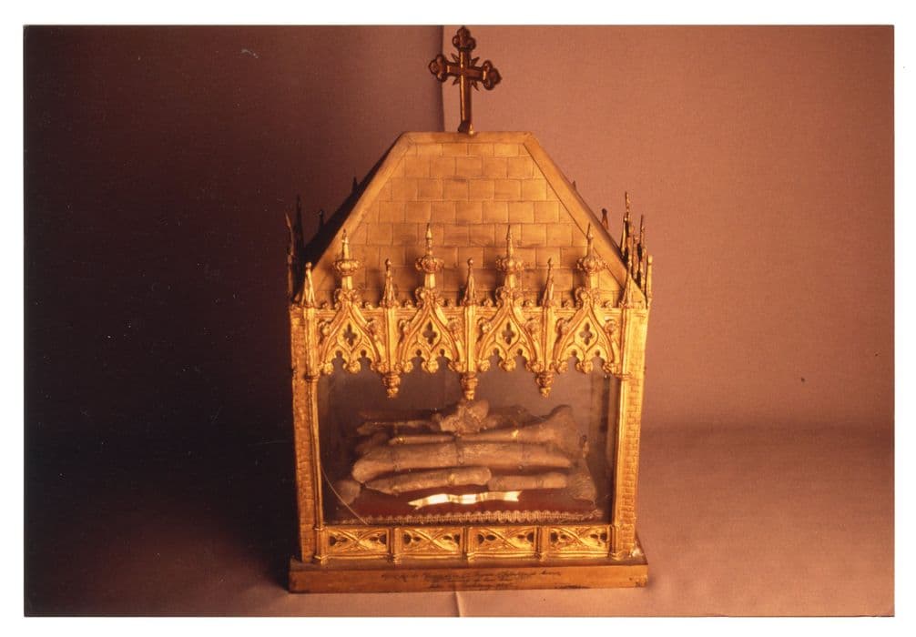 Châsse adoptant la forme d'une chapelle néo-gothique. Série d'arcs en accolade, cantonnés de pinacles, en partie supérieure. Toit à croupe sommé d'une croix.