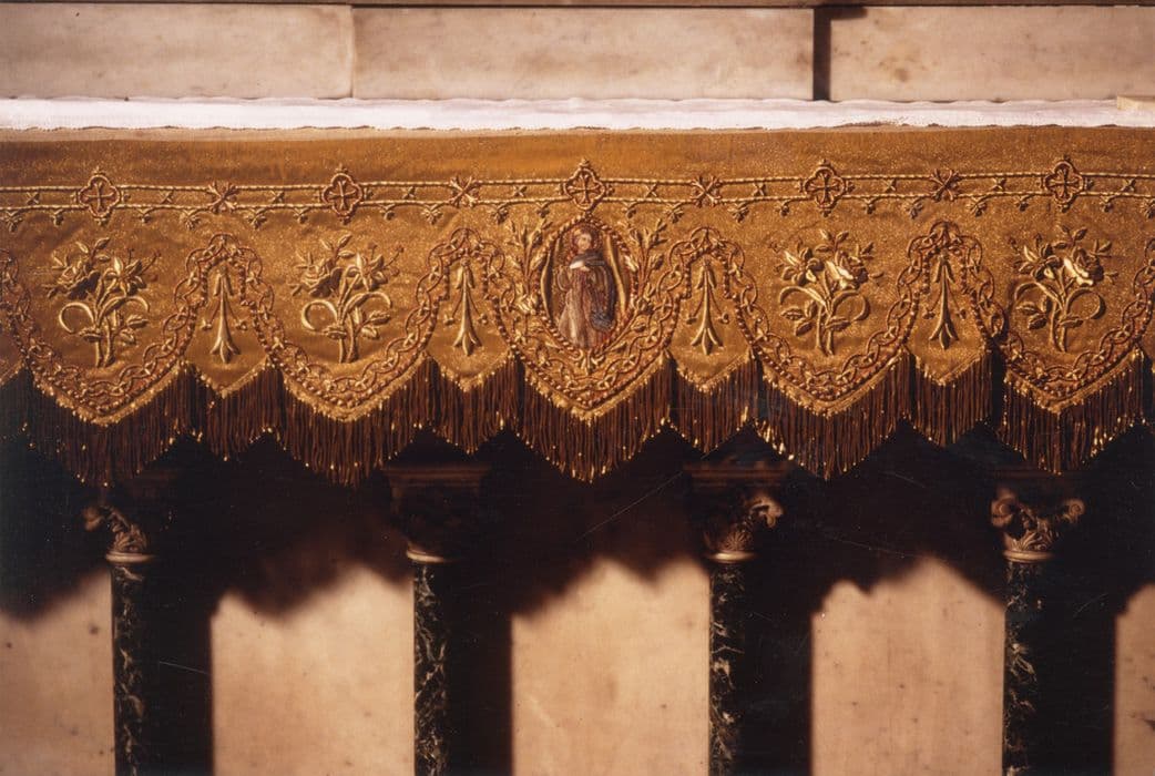 Autel-tombeau rectangulaire en marbre blanc dont le devant est précédé de colonnettes de marbre noir. Il est surmonté d'un gradin d'autel.