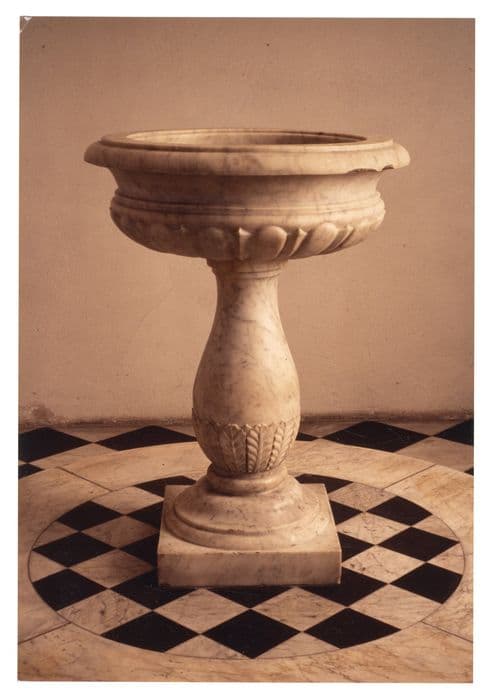 Bénitier en marbre blanc. Socle carré, pied circulaire et fût orné de feuilles stylisées à la base. Coupe circulaire ornée de godrons.