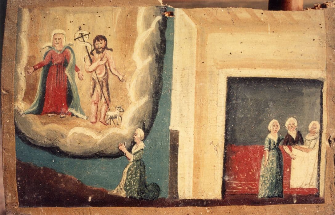 ex-voto : Femme dans un lit et femme en prière devant Saint Jean et un autre saint