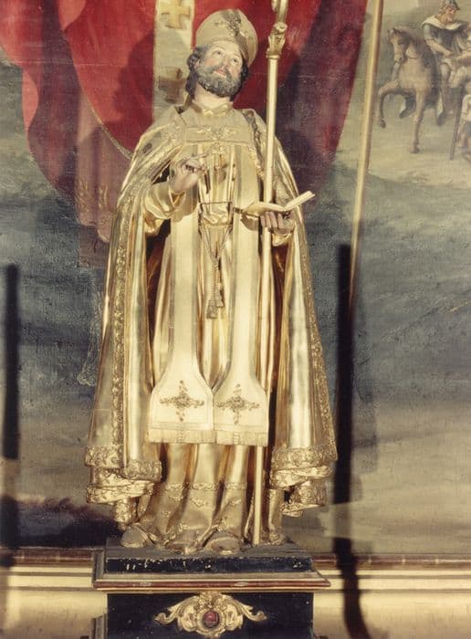 Le saint, vêtu en évêque, tient un livre ouvert dans sa main gauche et incline son visage à gauche.