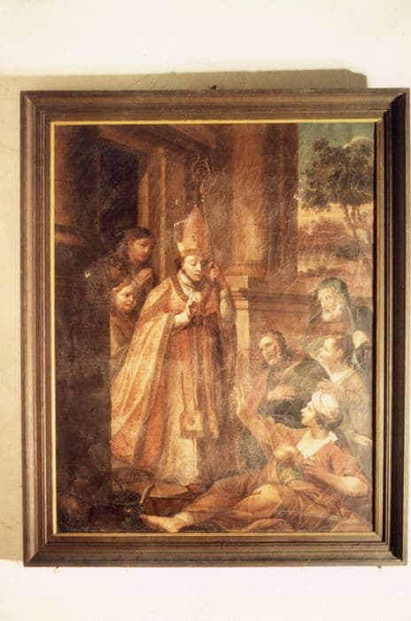 Le saint, vêtu en évêque, bénit un homme couché à terre avec son enfant.