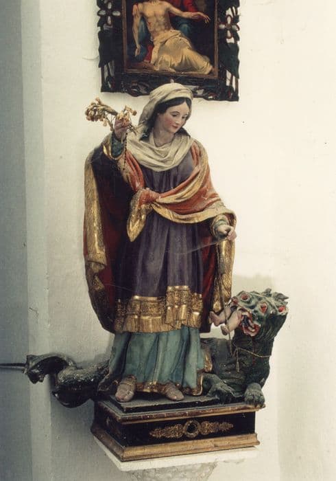 La sainte se tient debout, tenant un dragon au bout d'une corde. Ce dernier a un enfant dans la gueule, dont on aperçoit les jambes.