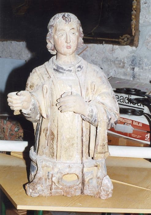 Le saint a les cheveux mi-longs et bouclés. Il porte une étole qui retombe sur ses avant-bras.
