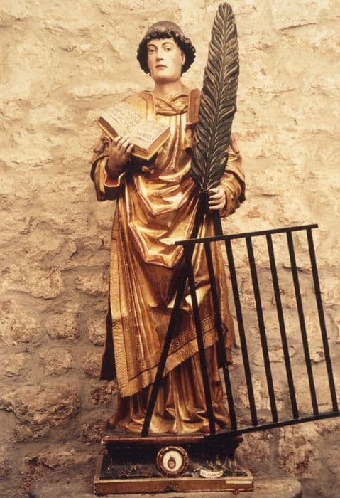Le saint, debout, tient une grande palme de martyr dans sa main gauche et un livre ouvert dans sa main droite.