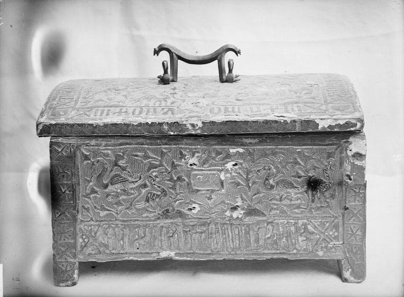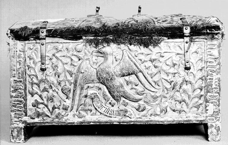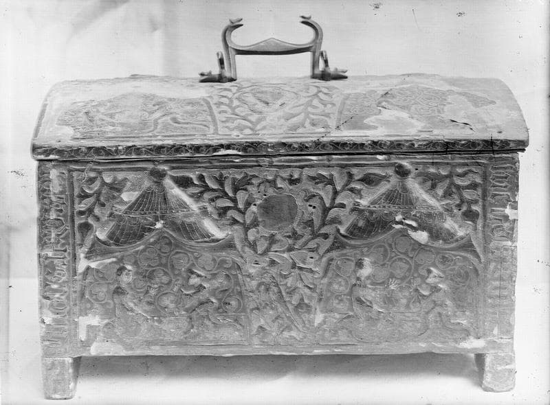 Coffrets de mariage en bois recouverts de pâtes gauffrées et dorées, au décor en relief.