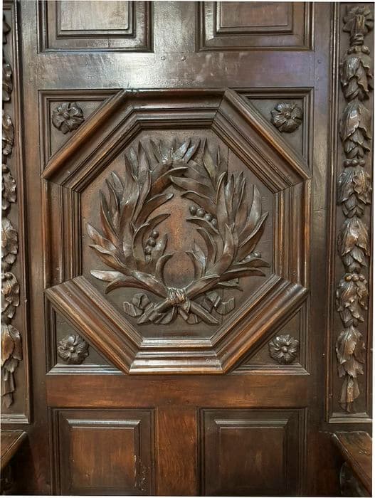 Pieds tournés. Accoudoirs portés par des chimères. Dossier élevé et encadré de deux chutes de feuillage et décoré au centre d'une couronne de laurier dans un cadre octogonal mouluré. Dais porté par des consoles à tête d'ange.
