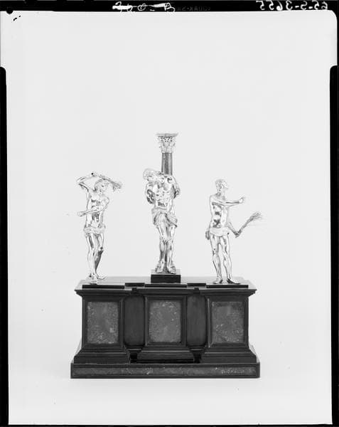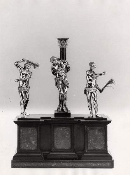 Groupe de 3 statuettes d'argent reposant sur un socle d'ébène incrusté de lapis-lazuli.