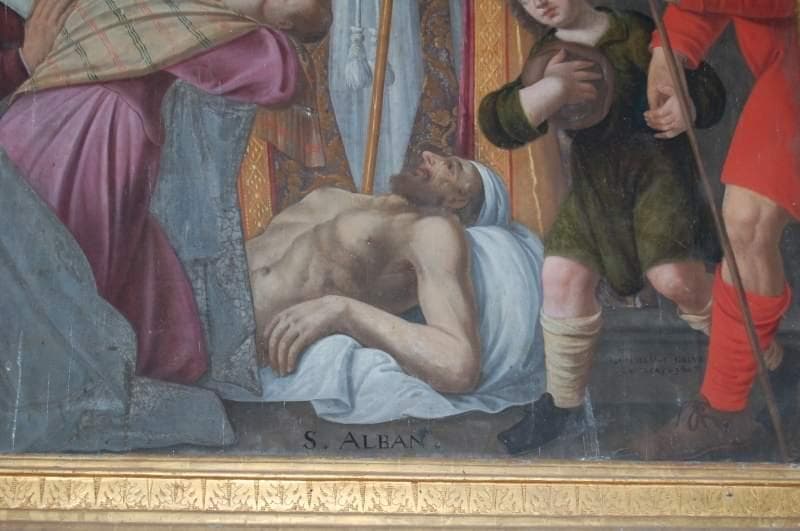tableau et son cadre (élément de retable) : saint Alban guérissant les malades