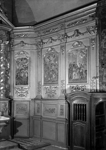 Quatre bas-reliefs, en bois peint, sont encastrés dans les boiseries.