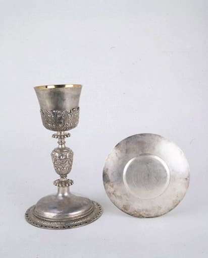 La coupe est garnie, à sa base, de feuillages qui en épousent la forme jusqu'à mi-hauteur. Le noeud, entre deux collerettes garnies de petites boules sur le pourtour, est orné de trois angelots. Le pied marqué à l'avant d'une croix gravée avec trois clous également gravés, est garni sur le pourtour de palmettes à peine ajourées au bord.