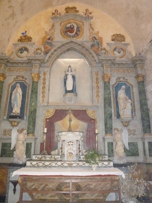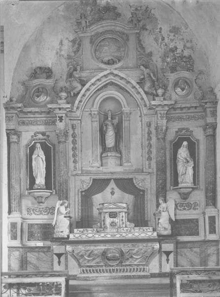 Retable du maître-autel (sauf la partie centrale). Les parties supérieures et latérales (à l'exception des deux statues en plâtre des niches latérales) sont du 17e siècle. La statue en bois de sainte Radegonde, couronnée, tenant le sceptre de la main droite et présentant l'église de la main gauche, est de la même époque. La niche de la statue de la sainte, la toile peinte, les anges adorateurs, le tabernacle et l'autel semblent dater du 1er Empire.