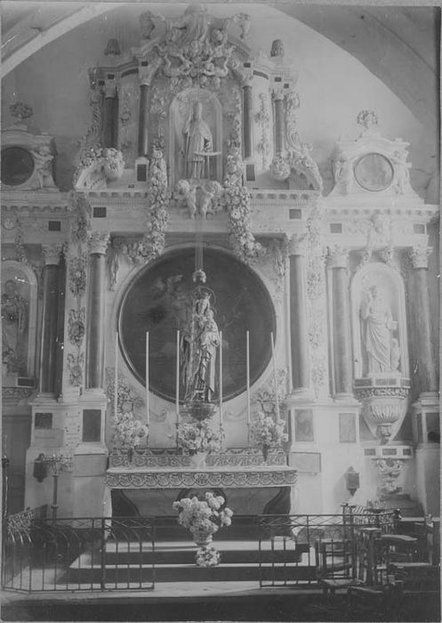 Partie centrale du retable ornée d'un médaillon circulaire enfermant une toile peinte. Parties latérales ornées de niches. Six colonnes aux chapiteaux composites soutiennent un entablement à la frise ornée de rinceaux. Au-dessus, aileron de même ordre. Sur les côtés, deux médaillons peints entourés de vases de fleurs.