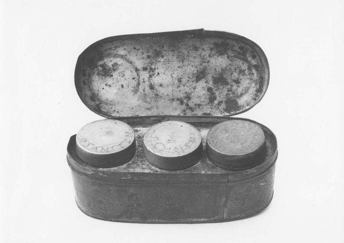 Boîte aux saintes huiles. Fer pour la boîte, ampoules en étain.