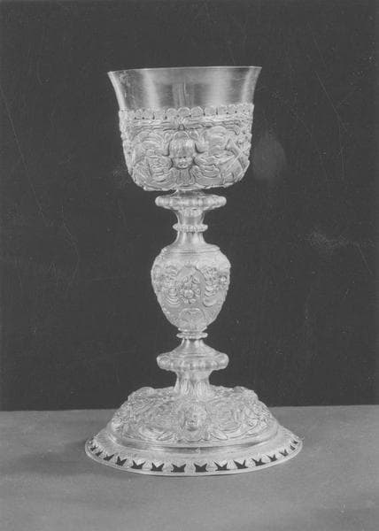 Coupe et patène dorées. Fausse coupe décorée de trois têtes d'angelots et trois motifs de la Passion. Noeud et pied décorés de trois têtes d'angelots et trois motifs de fruits. Pied à palmettes ajourées. Sur la patène, le Couronnement de la Vierge.