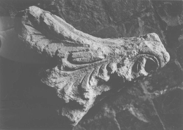 960-1-9. Fragment d'un modillon à palme et copeaux. Seuls subsistent la palme d'un côté et les enroulements de l'autre.
