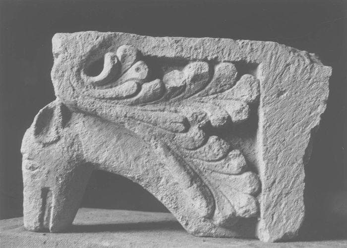 960-1-6. Fragment d'un modillon à palmes. Tête animale intacte. Queue brisée.