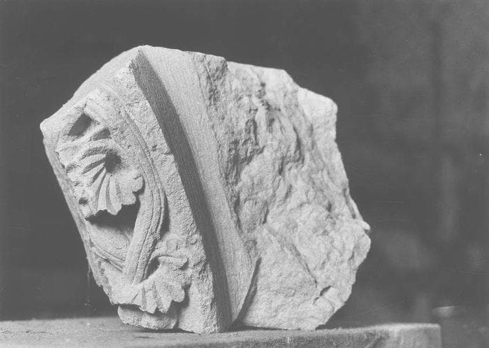987-1-55. Claveau (fragment). Gorge ornée de rinceaux à petites feuilles. Décor similaire sur le n°987-1-54.