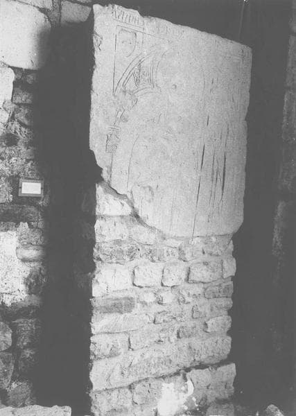 Pierre tombale. Lettres assez régulières. Grande effigie dont ne subsiste, assez abîmée, que la partie supérieure, avec deux écussons devenus illisibles.