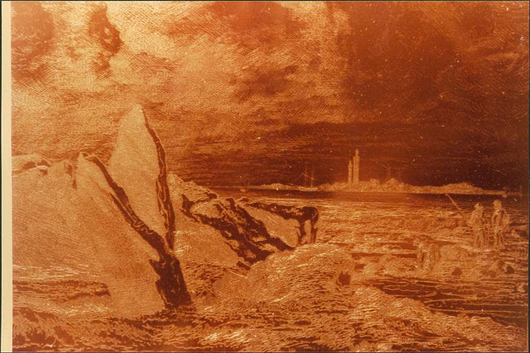 POP | Plateforme ouverte du patrimoineplaque d'impression : Noirmoutier, dolmen renversé à la pointe de l'Herbaudière, l'îlot du pilier