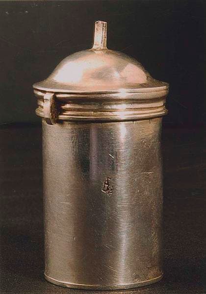 Ampoule aux saintes huiles en argent, de forme cylindrique, fermée par un couvercle.