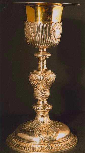 Calice en argent et argent doré, à motif de cartouches, de grappes de raisin, de croix, de frises de motifs géométriques.