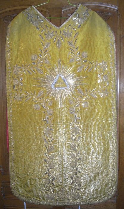 chasuble, étole de clerc, manipule, voile de calice, bourse de corporal (ornement jaune)
