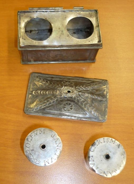 Le coffret aux saintes huiles en argent est de forme rectangulaire, fermé par un couvercle à quatre pans autrefois surmonté d'une croix.