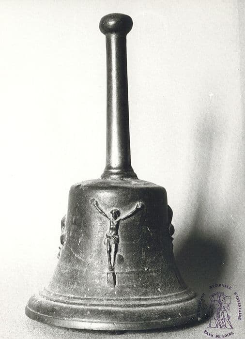 La cloche d'autel est décorée d'un Christ en croix et de trois fleurs de lys.