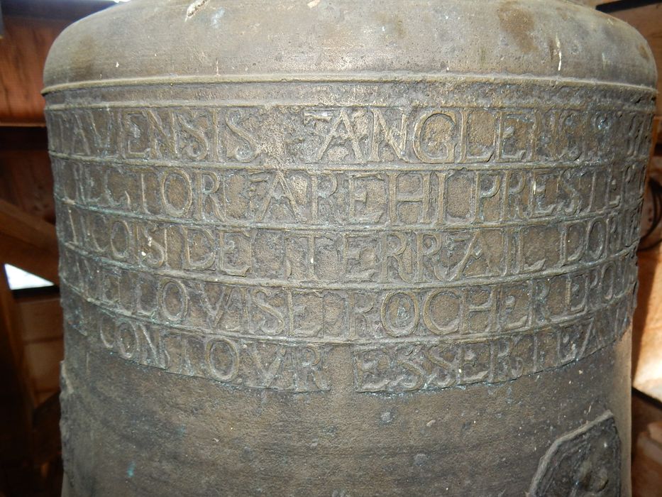 transcription : AN 1700 ANTONUIS EPISCOPUS PIETAVIENSIS, ANGLENSIS BARO HUJUS ECLESIOE FUNDATOR. FRANCISCUS MOREAU, PRIOR RECTOR ARCHIPRESTER COMMISUS... ABBATIS ANGLE. PARAIN VICARIUS GENERALIS MRE JEAN ; FRANÇOIS DE TERRAL D'ORNAISON, ABBE D'ANGLES. ET MARAINE HAUTE ET PUISSANTE DAME LOUISEROCHER, EPOUSE DE HAUT ET PUISSANT MRE CHARLES DE MOUSSY, SEIGNEUR DE LACONTOUR ESSERTEAUX. NICOLAS ET PIERRE AUBRY M'ONT FAIT