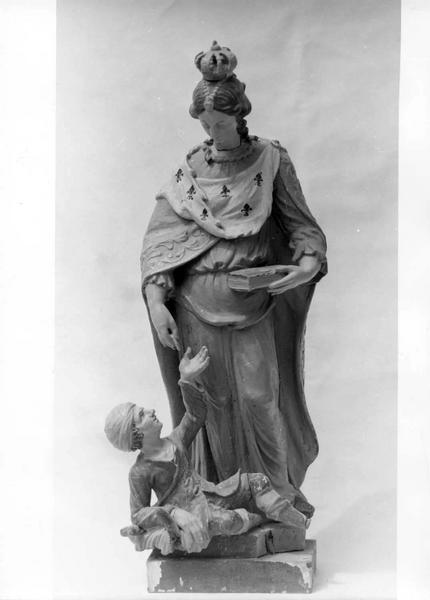 La tête de la sainte a été cassée et recollée. La jambe gauche du mendiant est cassée. Le socle inférieur est rapporté.