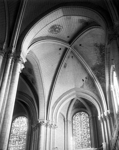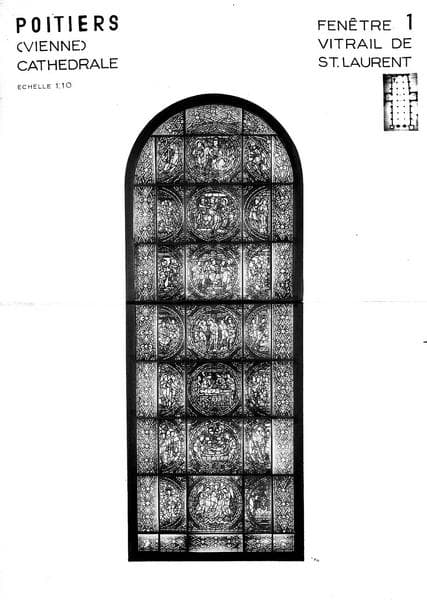 POP | Plateforme ouverte du patrimoine3 verrières : rédemption, Crucifixion, Résurrection, Ascension, Jugement et martyre de saint Pierre et saint Paul, Descente du Saint-Esprit, saint Pierre prêchant, saint Pierre et saint Jean bénissant la foule, résurrection de Tabitha, saint Pierre libéré de prison, chute de Simon le Magicien, saint Pierre et saint Paul comparaissant devant l'empereur, Jésus portant sa croix, saint Laurent amené devant un prince et des soldats, saint Laurent devant ses juges, un juge et le saint devant un prince et une foule de pauvres, visite du Christ à la prison du saint, le martyre de saint Laurent, l'enterrement de saint Laurent, le tombeau du diacre (baies 0, 1, 2)