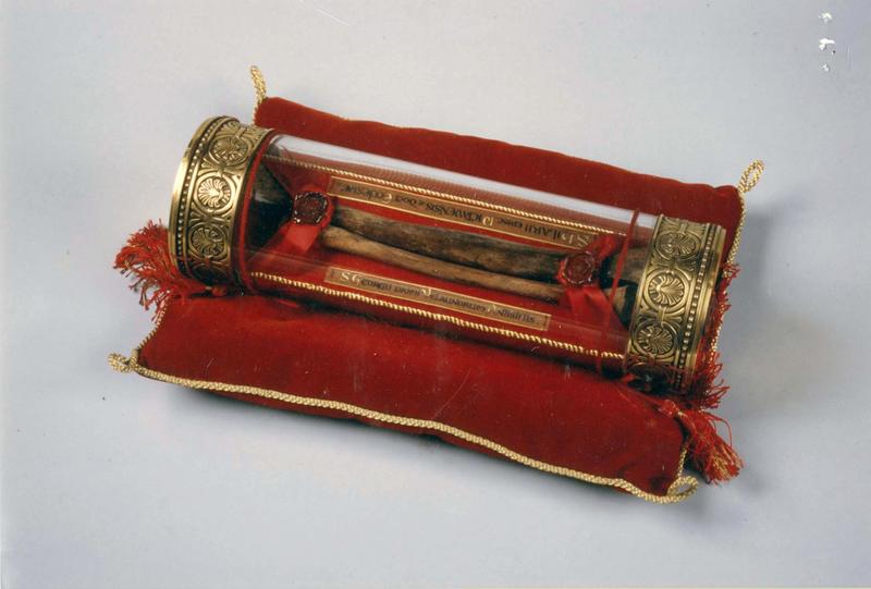 Reliquaire en forme de tube contient les reliques de saint Hilaire : un os long.