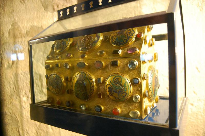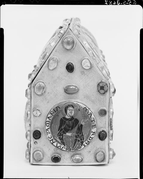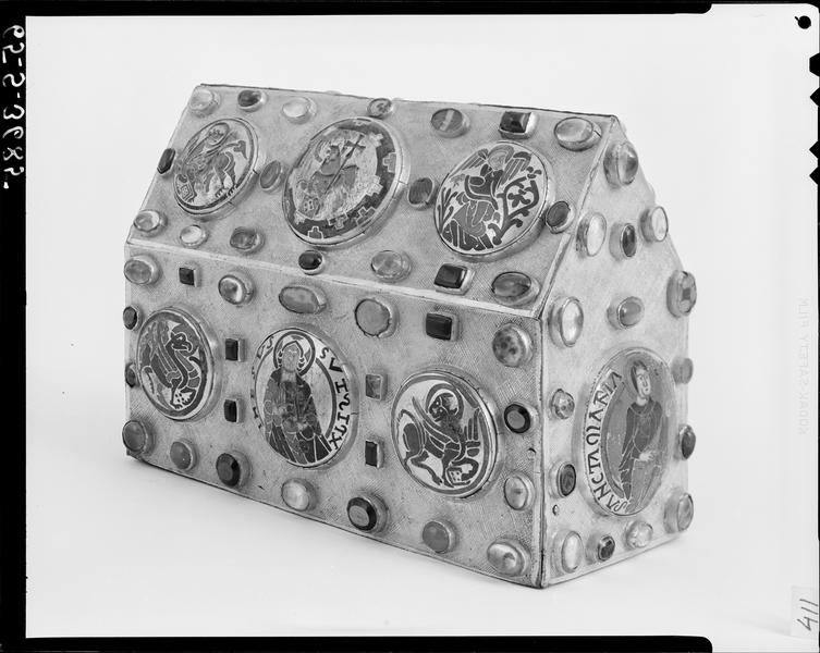 Cette châsse datable des années 1120-1140 pourrait provenir d'un atelier hispano-limousin. Elle remploie des intailles et un camée antiques.