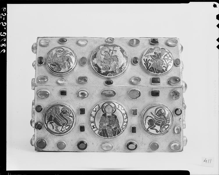 Les médaillons émaillés représentent à l'avers : sur la caisse le Christ, un griffon (pour l'aigle de saint Jean) et un taureau, au rampant l'Agneau de Dieu entre un ange et un lion, sur le rampant du revers figurent deux oiseaux affrontés accostés de lions, sur le pignon gauche l'Agneau de Dieu et sur le pignon droit la Vierge. La gamme chromatique des émaux est bleu foncé, bleu turquoise, vert et blanc. Les intailles représentent des personnages masculins tenant une épée, un bouclier, un instrument de musique ou un arc, d'autres sont décorées de fougères (?) Sur le camée un satyre combat un bouc.
