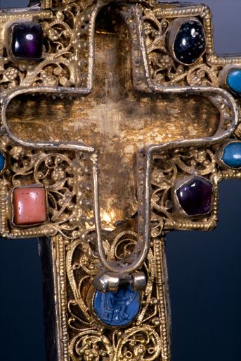 La croix-reliquaire, qui date du 13e siècle, a été réparée et montée sur le pied aux environs de 1613-1622. Les pâtes de verre imitent des camées antiques.
