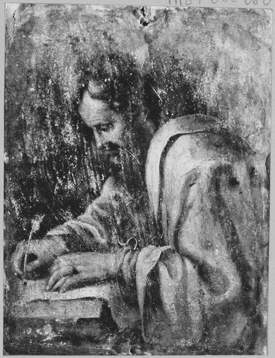 Le saint homme est représenté en buste, assis devant un entablement gris situé sur la gauche. Il présente son profil gauche, marqué par de longs cheveux, une barbe et une moustache blanches. Il est vêtu d'une tunique bleu clair. Un manteau jaune est jeté sur son épaule et son bras gauche. Il est occupé à écrire sur un parchemin blanc avec la plume qu'il tient dans la main droite. Cette iconographie ne permet pas d'affirmer qu'il s'agisse d'un docteur de l'Eglise.