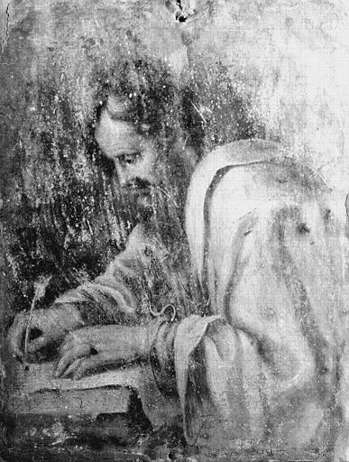 Cette peinture sur cuivre du 17e siècle, représentant un Docteur de l'Eglise, possède un pendant représentant Sainte Catherine d'Alexandrie (cf. notice PM87000059).
