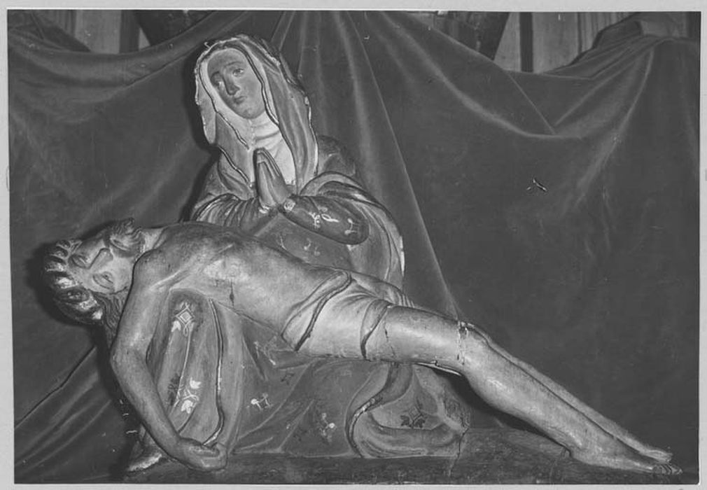La Vierge assise joint les mains au-dessus du corps du Christ qui est étendu sur ses genoux. Elle est vêtue d'une guimpe, d'une robe à motifs de fleurettes et d'un manteau drapé, également orné de fleurs et de feuilles, qui laisse apercevoir le bout arrondi du soulier droit. Le Christ est vêtu d'un très court perizonium blanc, retourné dans sa partie supérieure. Sa tête, de face, est très nettement renversée vers l'arrière, les yeux sont ouverts, la bouche entrouverte est soulignée par une fine moustache et une barbe bifide. Les cheveux ondulés s'échappent verticalement de la grosse torsade qui représente la couronne d'épines.