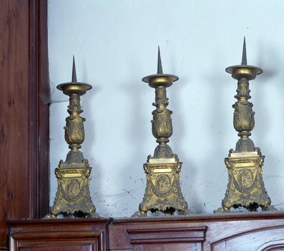 Chandeliers : h = 90 ; base : la = 31 ; bobèche : d = 19. Croix : h = 141, la = 50 ; base : h = 33, la = 35.