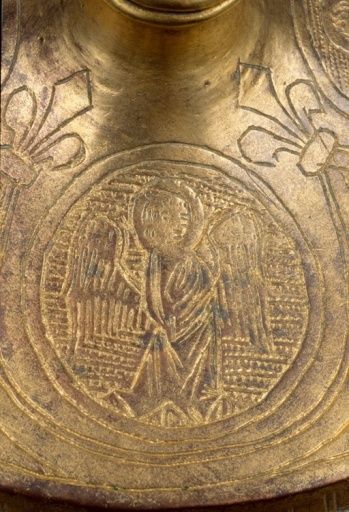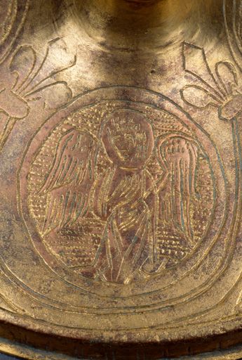 Le pignon à bordure festonnée est encadré de pinacles, il est surmonté d'une croix tréflée gravée de quatre-feuilles simplifiés. Des trèfles sont repercés à ses angles ainsi que deux baies tréflées à sa base. Au centre prend place le cristal cerclé d'une bordure de rinceaux. Le fond du pignon est gravé de rinceaux, de filets et de cercles organisés en rangées. Les bandeaux entourant le cylindre sont découpés en festons et gravés d'un réseau de losanges. Les plaques circulaires des extrémités présentent un quadrilobe dont le centre carré renferme une fleur, chaque lobe est gravé d'un motif feuillagé. Le noeud de la tige, enserré entre deux bagues moulurées, présente une ornementation de pétales. Quatre médaillons circulaires accueillent des anges sur le pied. Fleurons et fleurs de lys s'intercalent entre ces médaillons.