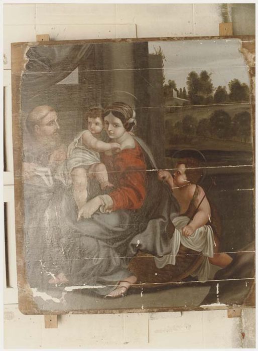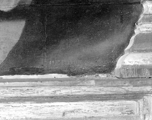 Oeuvre surdécorée (?) : il semble que la peinture ait été réalisée alors que les planches étaient déjà assemblées dans le cadre, peut-être sur une oeuvre plus ancienne. Oeuvre restaurée par Pierre Laure en 1984.