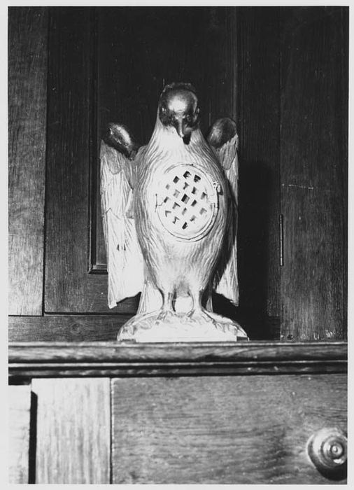 Cette statuette monoxyle comporte une petite terrasse. A l'avers est ménagée une logette à relique doublée de métal doré et fermée par une porte grillée en métal argenté montée sur charnières. La statuette est argentée à la feuille (argenture brillante) pour le dessus des ailes, la partie antérieure de la tête, les pattes et le bord de la terrasse. Le reste du plumage et le dessus de la terrasse est peint couleur argent mat.