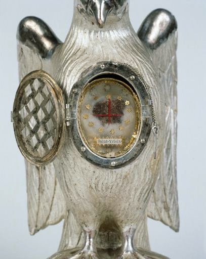 Ce reliquaire-monstrance en forme de colombe date du 18e siècle. Le réceptacle contient un fragment d'os identifié par une étiquette imprimée : Saint-Yrieix.