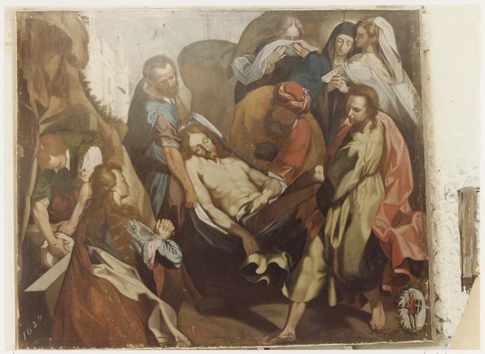 Ce tableau intitulé le Portement du Christ mort a été réalisé en 1629 d'après une estampe d'un membre de la famille Sadeler, estampe elle-même réalisée d'après un dessin de Baroccio daté du début du 17e siècle et conservé au musée du Louvre. La présence d'un emblème de la confrérie de saint Domnolet laisse penser que ce tableau pourrait provenir de l'église Saint-Domnolet de Limoges, aujourd'hui détruite.