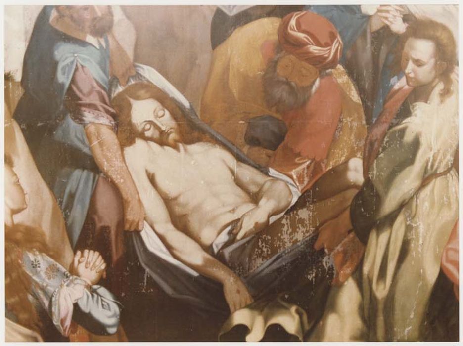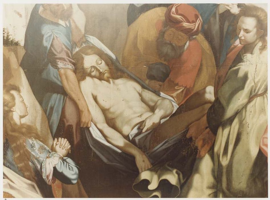 Sur la partie gauche de la toile est agenouillée sainte Madeleine, quasiment de dos, elle joint les mains en prière. Sa longue chevelure châtain se répand sur une riche robe bleue et sur un manteau moutarde. A sa gauche, un homme est penché en avant, à nettoyer le tombeau du Christ avec une étoffe blanche. A l'arrière, rochers brunâtres et fortifica- tions traitées en camaïeu de gris servent de fond. Le centre du tableau est réservé au corps du Christ mort, porté sur un linceul par Nicodème à la tête et saint Jean aux pieds. Derrière, Joseph d'Arimathie, richement vêtu d'une tunique rouge, d'un manteau jaune et d'un turban mêlant les deux couleurs, se penche sur le corps. Devant un rocher formant l'arrière-plan de la partie droite de la toile, la Vierge joint les mains en prière. Vêtue d'un manteau bleu passé en voile sur la tête, elle témoigne d'une grande affliction. Deux saintes femmes la soutiennent de part et d'autre.