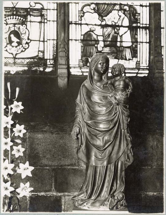 Traces de polychromie. L'auriculaire de la main droite de la Vierge et la fleur qu'elle tenait sont brisés.